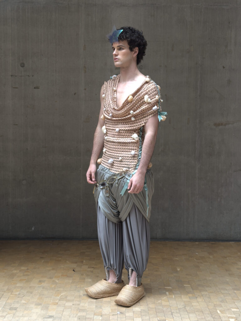When studying BA Fine Art, Antonio did a project about insects that involved sewing sculptural garments which were hung as an art installation resembling an insect nest. He reimagined the lifecycle of a mayfly, making the adult with wings, the egg sacs, the caterpillar, worm and larvae. “I used stockings to make the larvae,” Antonio explains. Despite having never touched a needle and thread before, the project was a huge success and led to him studying womenswear design at CSM.