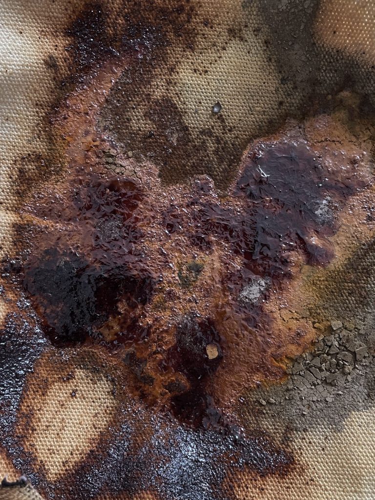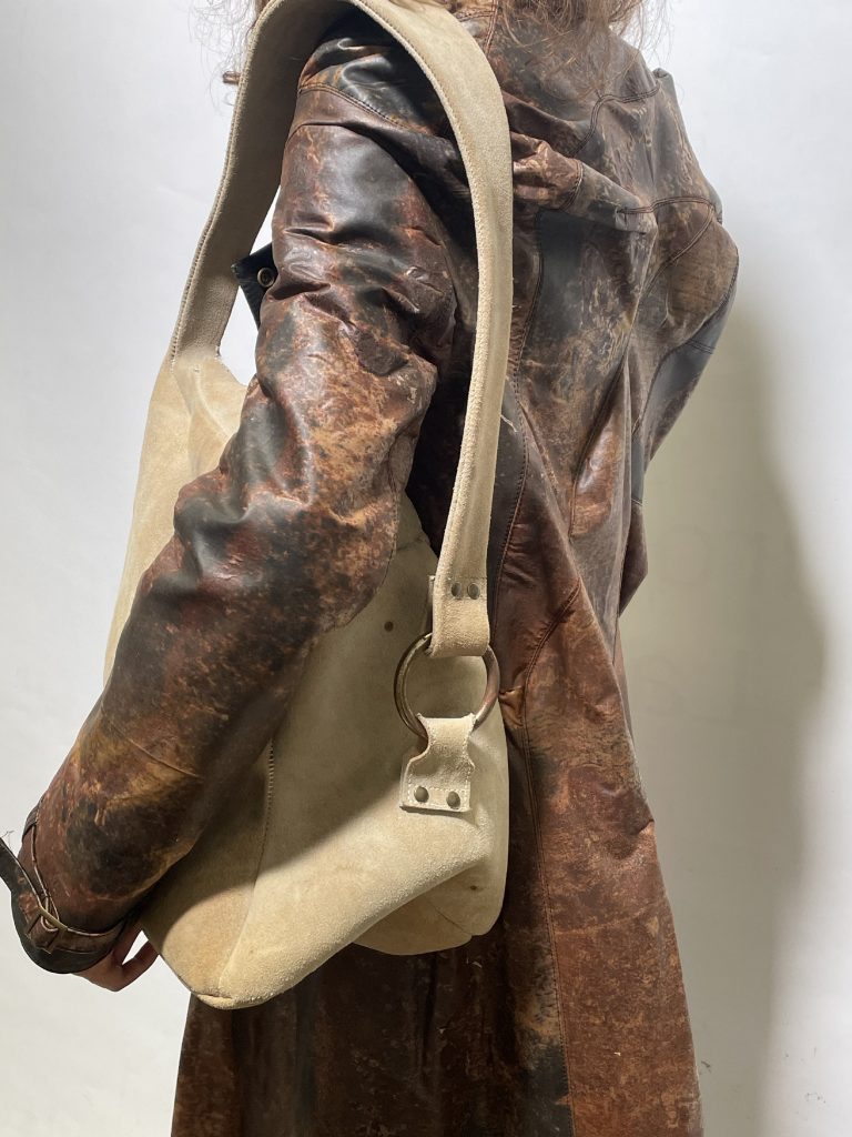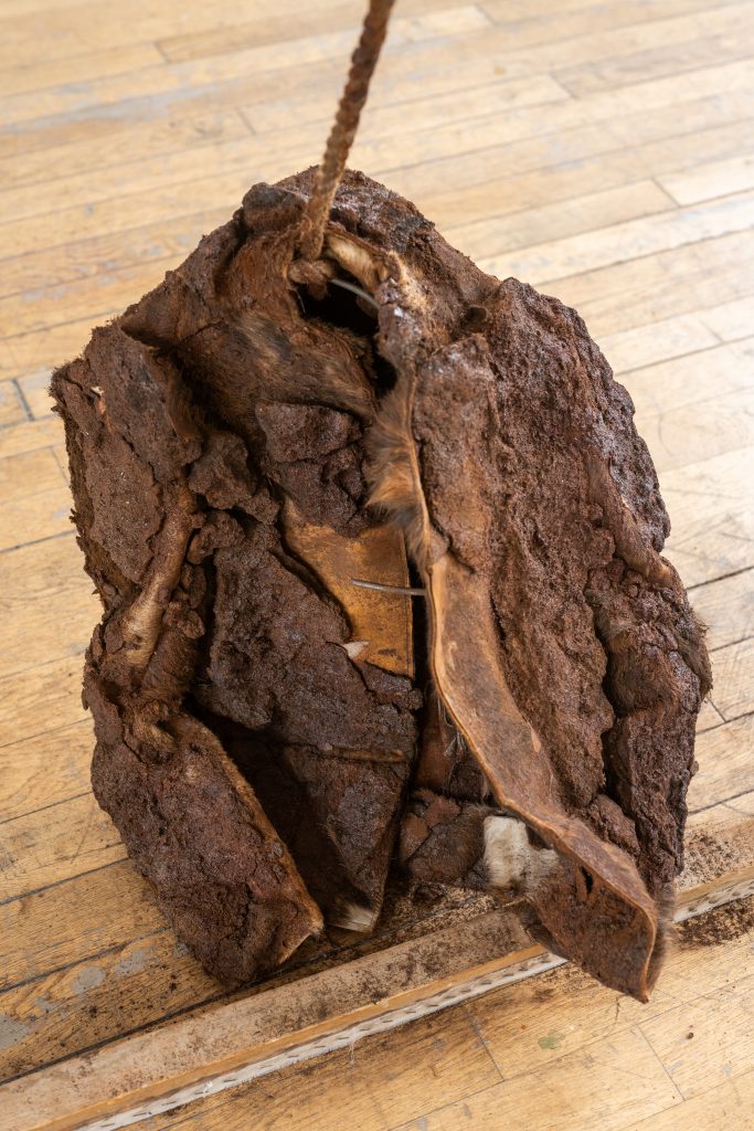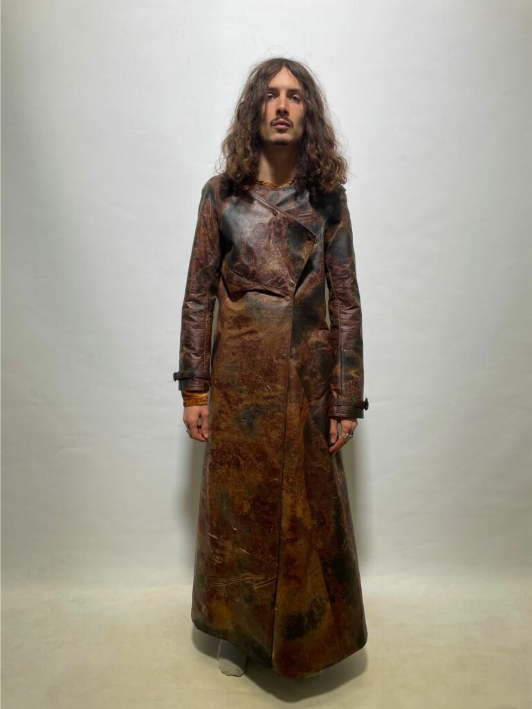 Taking direct inspiration from the cave’s textures and symbolism, Matringe began experimenting with rust crust techniques to forge a new, unconventional, decaying aesthetic. During his MA, he developed a distinct method to ennoble natural materials, cotton, linen, hemp, and second-hand leather, through oxidation and dye processes. The result is a series of matte, highly textural pieces in mud browns and deep, blood oranges that appear to be decaying before the viewers’ eyes. Standouts include a rusted leather belt with an oversized metal buckle and his Rusty Rocky Jacket, crafted from cowhide and treated to appear as if it has been resurrected from the depths of Zeus’ cave.