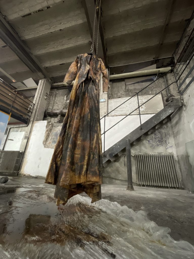 A long, lifeless dress hangs from a thick steel chain, its weight pulling at the hook above like a relic on display. The setting, part brutalist shell, part decaying warehouse, feels post-apocalyptic, all sharp edges and concrete rot. The garment itself, streaked with rust and frayed at the hem, bleeds oxidized pigment in slow drips onto a crumpled plastic sheet below. Each drop spreads into a sinister puddle of burnt orange and brown, like the aftermath of an industrial wound.