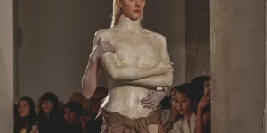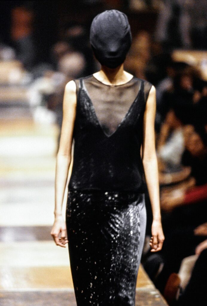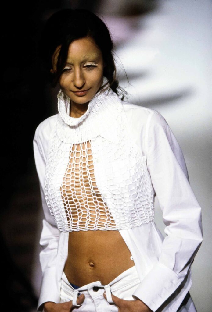 Ann Demeulemeester, in particular, shared Kawakubo’s commitment to monochrome and experimentation with cut, using fashion to question stereotypes of beauty and gender. Martin Margiela, another Royal Academy alumnus, drew directly on the spirit of deconstruction, leaving chalk marks and basting stitches visible. His now-iconic Tabi shoe, inspired by Japanese split-toe socks traditionally worn with sandals, stands as one of the clearest symbols of cultural crossover.
