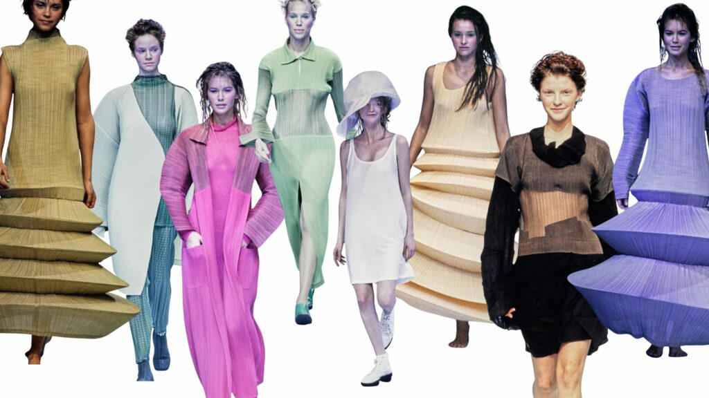One of Miyake’s most famous contributions was Pleats Please, a collection using lightweight polyester pleated after the garment’s construction. The pleats were heat-sealed, ensuring durability, wrinkle resistance, and practicality. These designs remain beloved more than thirty years later, with British Vogue reporting in 2024 that Depop searches for Pleats Please were up 39%. Miyake also helped introduce Japanese techniques such as shibori (tie-dye), sashiko (needlework), and origami into Western fashion. In many ways, what the West recognises as avant-garde often extends directly from Japanese traditions.
