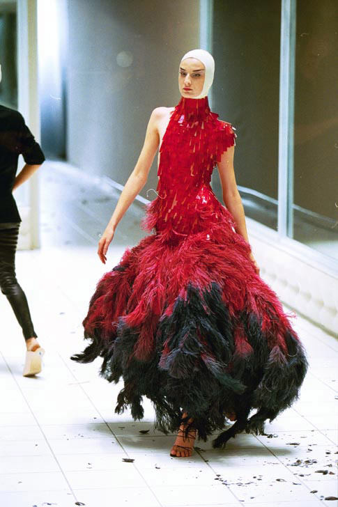 The finale look saw O’Connor return to the runway in a gown with an asymmetric bodice made from two thousand hand painted red microscope slides. The dress took six weeks to make and featured a voluminous skirt of dyed red ostrich feathers that cascaded into black before reaching the floor. The medical slides were used to invoke the idea of a body being studied under a microscope, and McQueen chose red because “there’s blood beneath every layer of skin.”