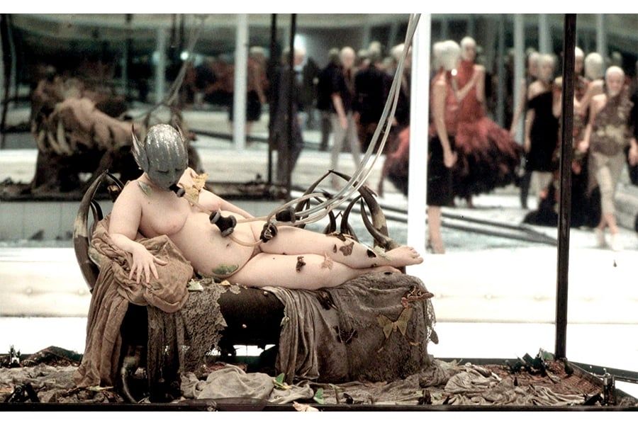 Once the models had left the catwalk and the lights had gone down, one would assume the show was over. Instead, the lights flashed back on to reveal a box smashing open and British writer Michelle Olley draped naked on a chaise lounge, wearing a silver respirator mask and 250 moths and butterflies flying off of her. In diary entries donated to The MET Museum, Olley described how she had to wait hours in the box and how she couldn’t move so as to avoid maiming the insects. The temperature had to be kept cold to keep the moths placid: “Cold air is being piped in, as when the lights go on at showtime, it will get really hot. The cold air is giving me goosebumps and making the glue/moth parts all around my body really itchy. My head’s hot, my body’s freezing.” The visual was a direct recreation of a 1983 photograph by Joel-Peter Witkin named Sanitarium, and created a sense of awe and shock amongst the audience.