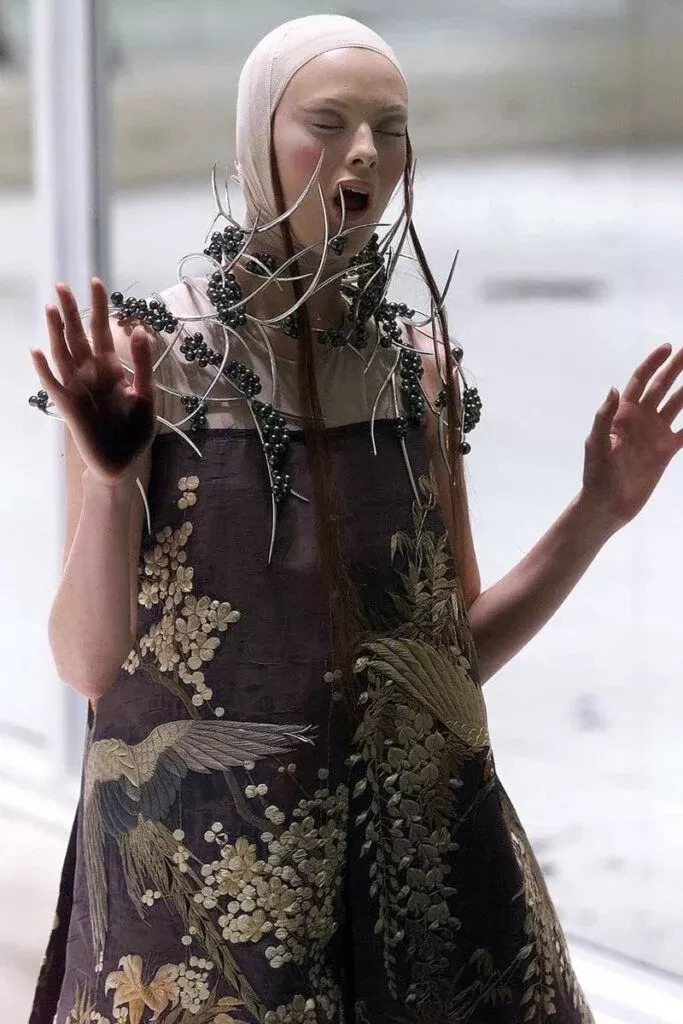 In Look 65, McQueen utilised shells again, this time 80 oyster shells for an underdress. The overdress was made from a Japanese screen embroidered with flowers and birds that McQueen had purchased at the Saint Ouen flea market in Paris. He fused the crumbling fabric to cotton and silk to stabilise its shape. The dresses were accessorised with a neckpiece made from silver and Tahitian black pearl by Shaun Leane, with pointed silver branches that curled up uncomfortably over the wearer’s neck and face, forcing her to hold her head carefully. Model Laura Morgan undertook the challenge of wearing a cuirass made completely out of glass by East London manufacturer Colombia Glassworks. The breastplate stood out in the collection for its crimson colouring and resemblance to flesh and blood. Morgan later recalled the fear she felt wearing that piece, as she was told before walking the catwalk, “If you trip, you’re a goner!” The delicacy and fragility of this piece tied thematically to the pressure and sensitivity of mental health and the constant need to keep oneself together to avoid breaking down.