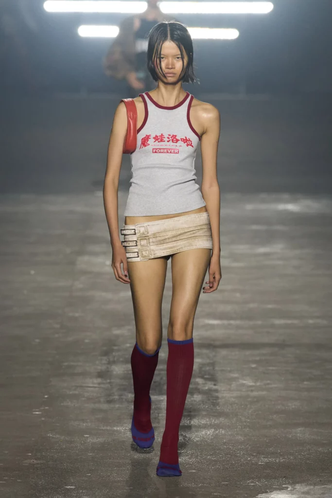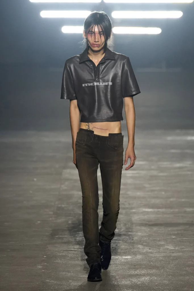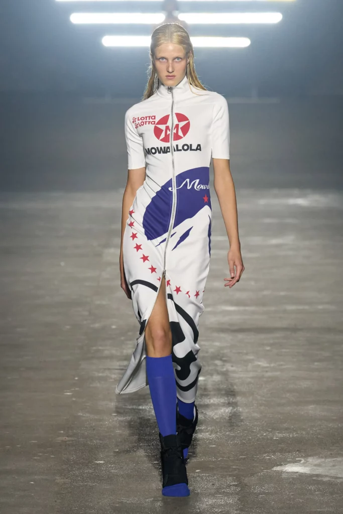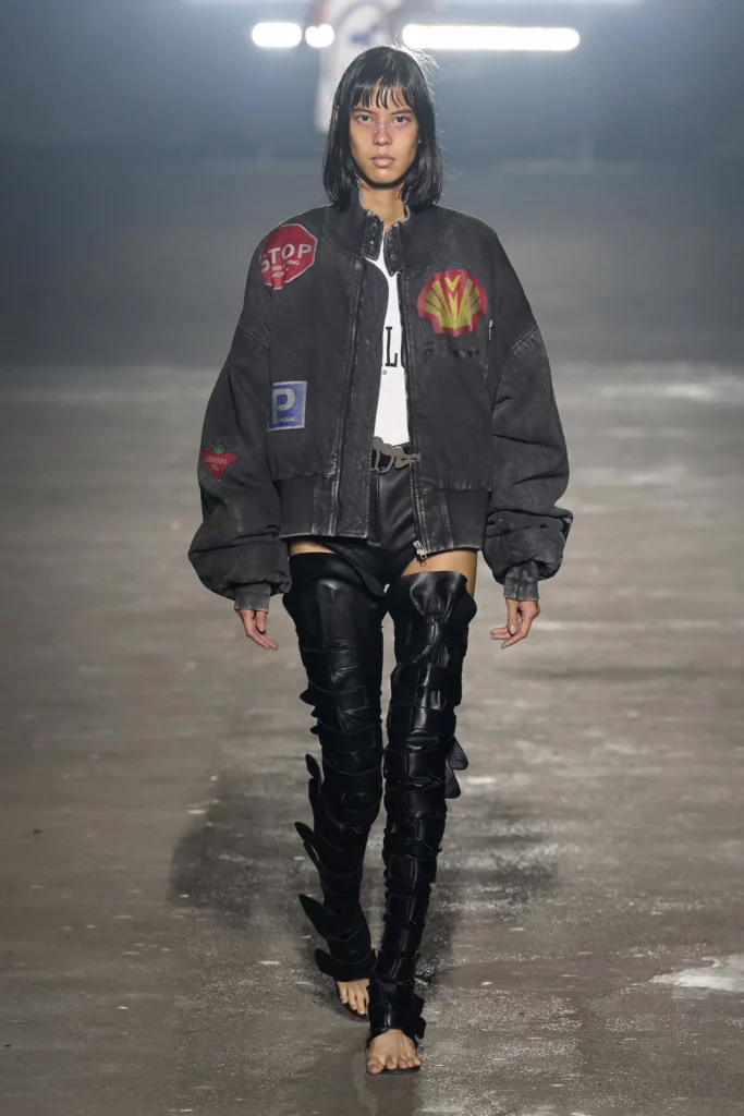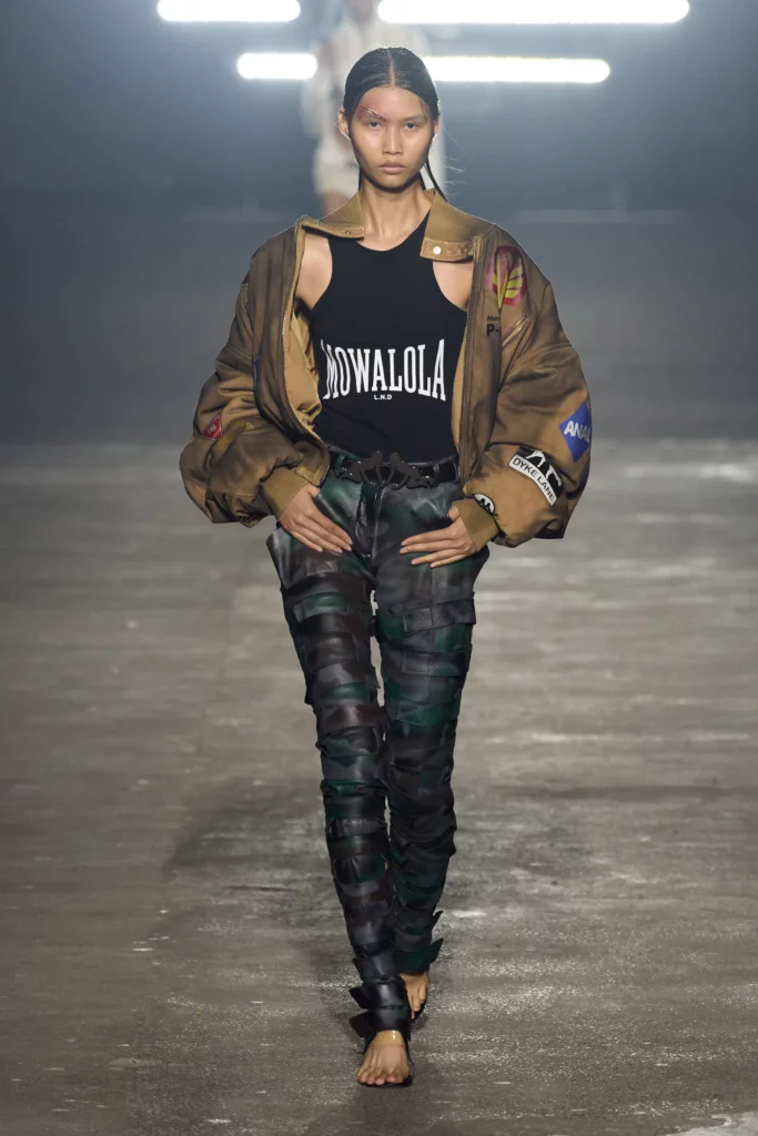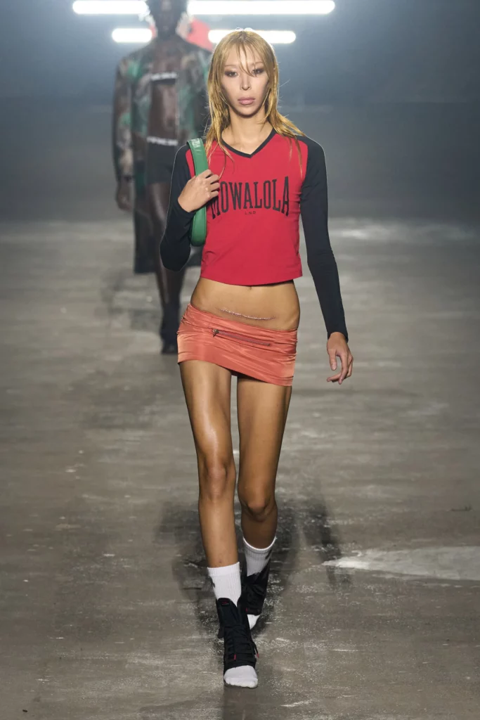 What Central Saint Martins alumna Mowalola Ogunlesi staged at London Fashion Week SS24 was nothing short of a car crash, in the best sense. Cronenberg’s controversial Crash, which won a Special Jury Prize at Cannes despite the protests of jury president Francis Ford Coppola, saturated the show. The collection featured racing circuit regalia, low slung leather miniskirts reminiscent of McQueen’s “bumsters,” elastic harnesses, bras belted along the back, and orthopedic chic open toe boots evoking Rosanna Arquette’s character and her leg brace.