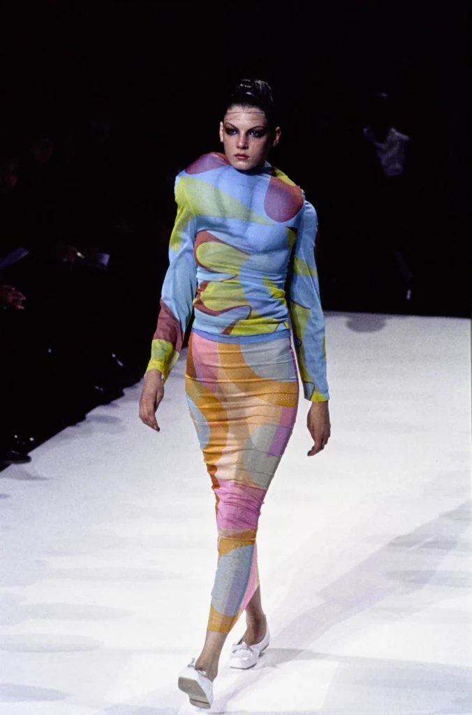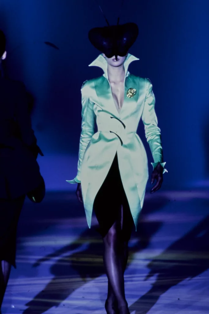 The late Manfred Thierry Mugler was a maestro of metamorphosis. For SS97, before unveiling his masterpiece Les Chimères, he presented a collection inspired by Kafka’s Metamorphosis, the documentary Microcosmos, and, most strikingly, Cronenberg’s The Fly (1986).