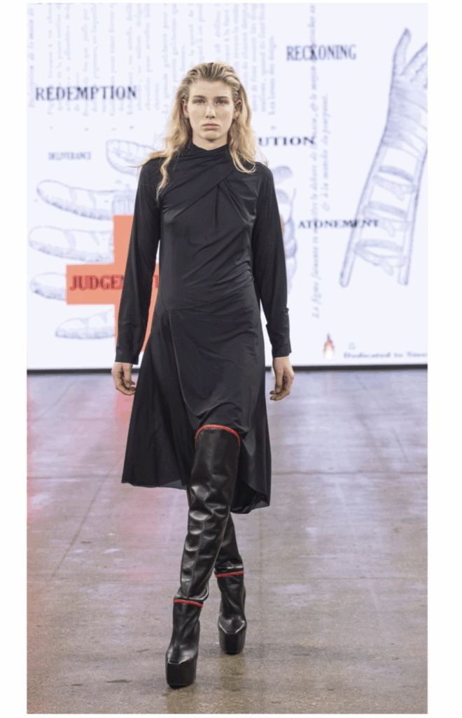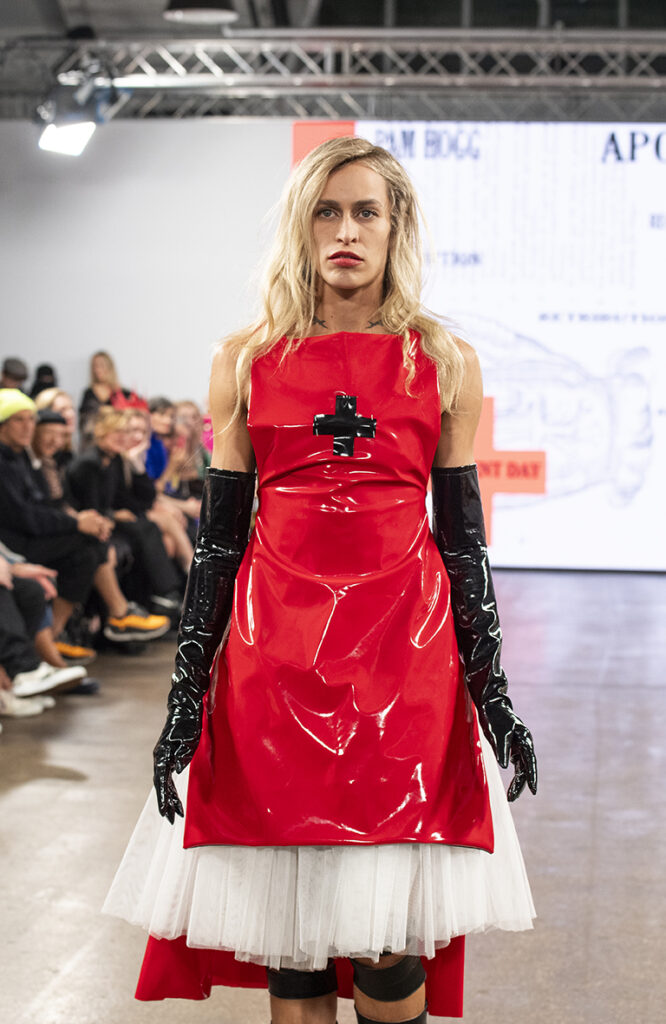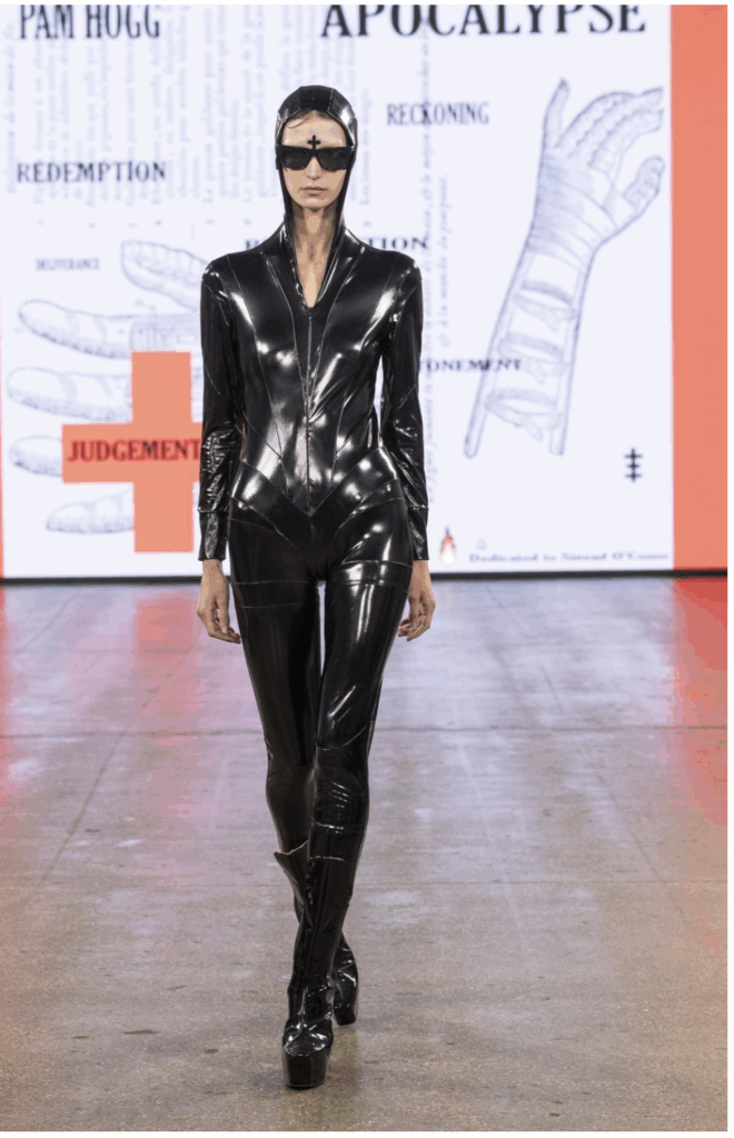 Pam Hogg’s SS24 collection, titled Apocalypse, was a latex drenched exploration of the tension between religion and science. Models paraded in red, white, and black nurse uniforms marked by medical crosses that doubled as crucifixes. The visuals showed medieval orthopedic gloves with words like “Redemption,” “Judgment Day,” and “Atonement.” While framed as a tribute to the late Sinéad O’Connor, it is hard not to see echoes of Crimes of the Future, Cronenberg’s exploration of surgical ritual as performance art and sex.