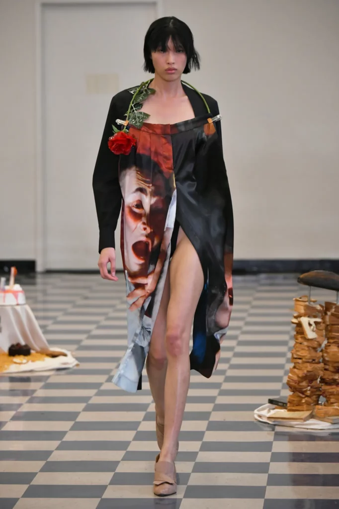 Surgical themes have long run through Cronenberg’s oeuvre, most recently in Crimes of the Future. Mark’s collection featured dresses printed with The Operation, an 18th-century painting by Gaspare Traversi depicting a man mid operation, screaming in agony. “It’s a mental breakdown movie about a set of twin doctors,” Mark said of Dead Ringers. “I do feel like we’re still working through the pandemic and how that psychologically affected us.” The result is a powerful push and pull, a tension between internal disorder and the desire to dress up, go out, and feel good again.