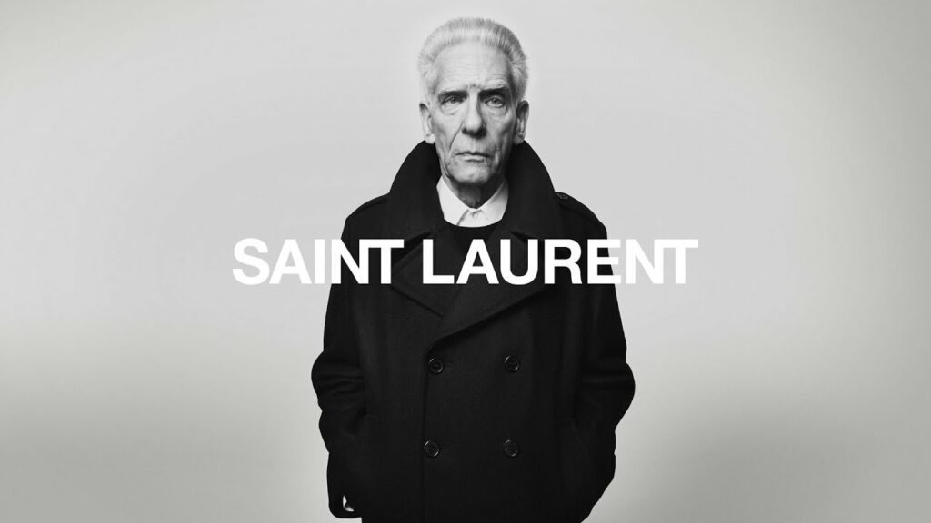 Vaccarello clearly took cues from Prada’s FW22 Menswear show, which featured cult film stars Kyle MacLachlan and The Fly’s Jeff Goldblum, both fashion forward “zaddies.” Since then, the Canadian director has appeared on YSL’s podcast, sat front row at shows, and even directed The Shrouds under Saint Laurent’s film wing.