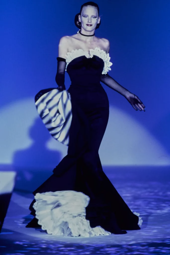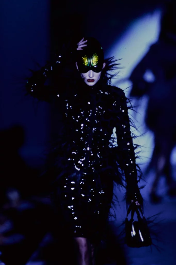 Eighty insectoid looks filled the runway of the Hôtel Ritz in Paris, antennae, exoskeletons, arthropod eyes, butterfly wings, and cocoons. Corsets, capes, and oversized blackout sunglasses transformed models into glamorous hybrids. Mugler’s vision leaned more toward the sublime than the grotesque, but Cronenberg’s influence was unmistakable, especially in the “tire” suit, a collision of rubber, leather, and erotic absurdity straight out of Crash.