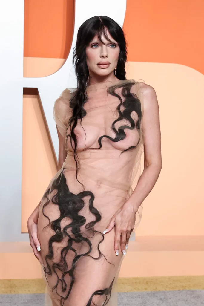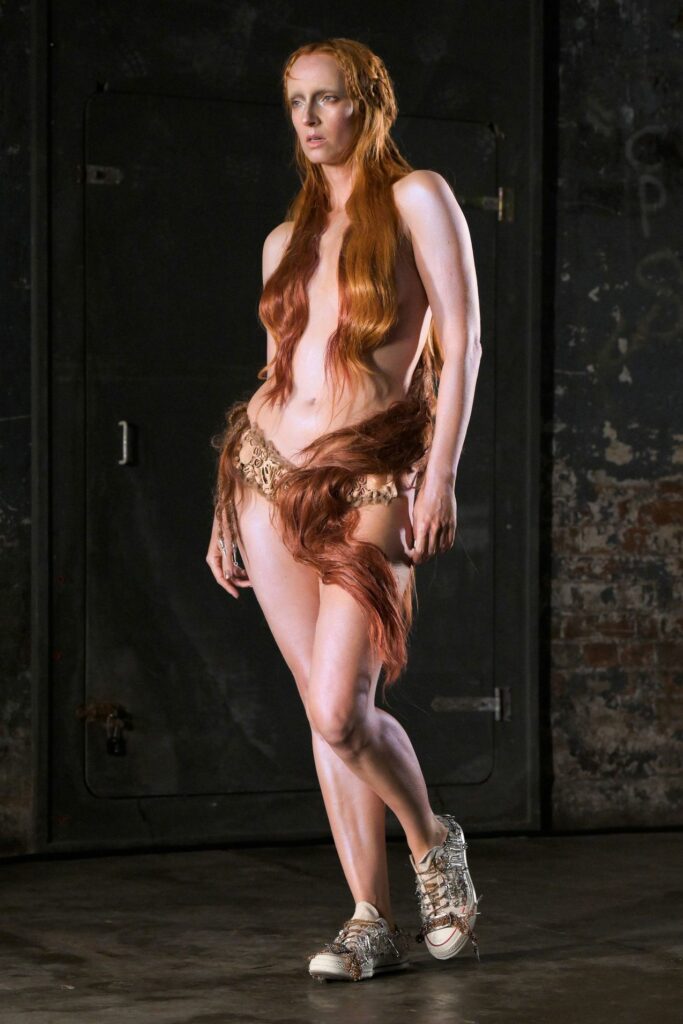 Fashion analyst Mandy Lee took to TikTok earlier this year to argue that the merkin revival is only a matter of time. “If it was in one of the most impactful shows of 2024, it’s only a matter of time before it trickles down,” she noted, pointing to Julia Fox’s Dilara Findikoglu gown made of gauzy nude fabric layered with long waves of hair, a vision echoing Botticelli’s Birth of Venus. Findikoglu’s Fall 2025 collection, Venus from Chaos, went further, with braided hair dresses, corsets embellished with tresses, and looks featuring red hair placed across breasts and crotch.
