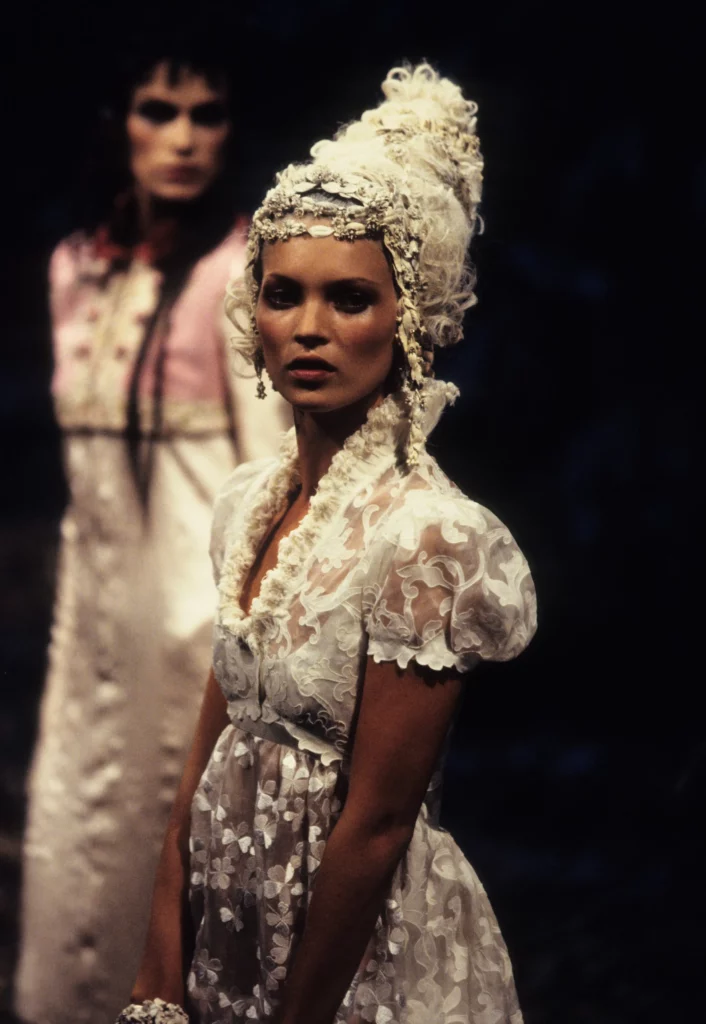 For 15 years, from 1996 to 2011, John Galliano reigned at Dior like a comet of extravagance. His Dior shows were pure moments of magic and excess: he’d pose his models as 18th-century marquises in a Hall of Mirrors set; he turned a runway into a tropical jungle for a collection inspired by Gauguin; he brought in locomotives, acrobats, avalanches of flowers. Each season he explored a different theme, ancient Egypt, the roaring 20s of Paris, imperial Mongolia, London’s punk scene, and translated it into sumptuous clothing. Galliano is a storyteller: each collection a baroque tale. He mastered the bias cut (influence of Madeleine Vionnet) with virtuosity, creating sheath gowns that flowed on the body like water. He also knew how to deconstruct, mix, surprise: at Dior he modernized heritage by introducing streetwear touches, tattoo prints, skirts over trousers. Rich clients fought over his creations, the press lionized him. Galliano became a global star, himself dressing up as a flamboyant character at show finales (as a ship captain, an astronaut, Louis XIV, …).