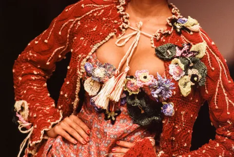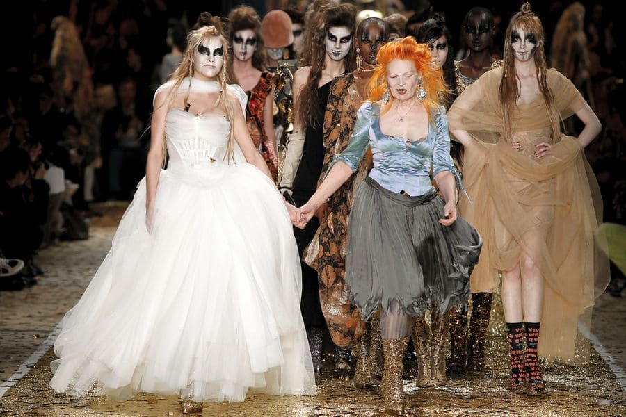 Collections such as Buffalo and Witches followed, merging global cultures, subversion, and historical fantasy into explosive hybrids. She reinvented the Victorian crinoline in mini form, introduced towering platform shoes, and caused Naomi Campbell’s famous catwalk fall in 1993, a moment as iconic as the shoe itself.